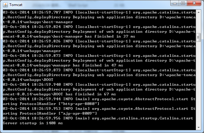 接著我們可以雙擊 startup.bat 啟動 Tomcat,彈出如下界面: