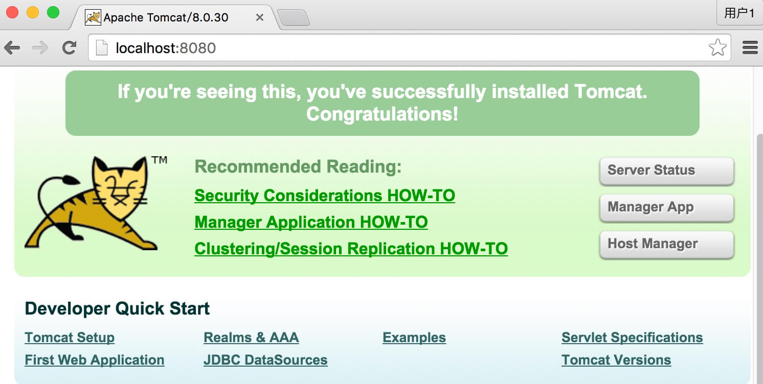 接著我們在瀏覽器中輸入 http://localhost:8080/,如果彈出如下界面,表示tomcat安裝成功并且啟動起來了: