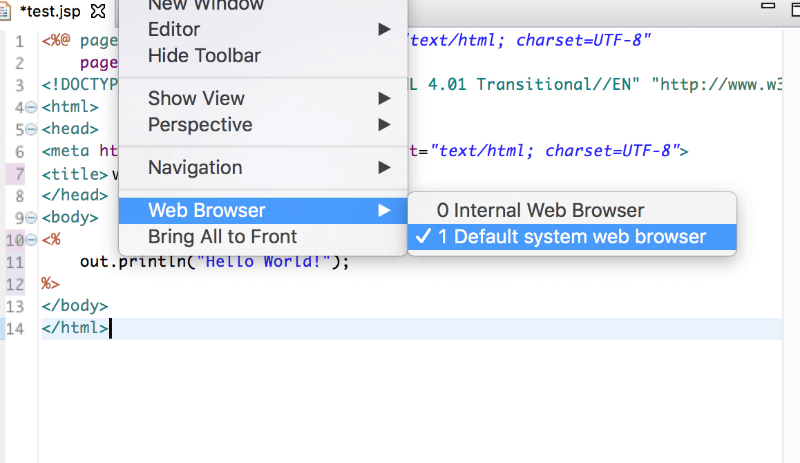 在WebContent文件夾下新建一個test.jsp文件。在下圖中可以看到它的默認代碼: