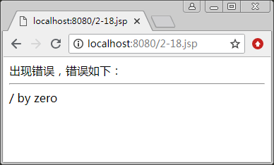 該程序執(zhí)行的是除法運(yùn)算,如果除數(shù)為 0,將會拋出一個(gè)數(shù)學(xué)運(yùn)算異常,從 errorPage="2-18error.jsp" 可以看出,程序指定 2-18error.jsp 為其處理異常。