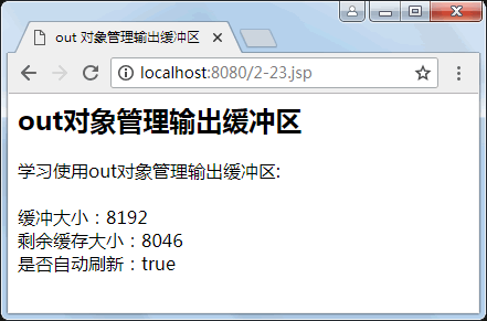 默認情況下,服務端要輸出到客戶端的內容不直接寫到客戶端,而是先寫到一個輸出緩沖區(qū)中。使用 out 對象的 getBufferSize() 方法取得當前緩沖區(qū)的大小(單位是 KB),用 getRemaining() 方法取得當前使用后還剩余的緩沖區(qū)的大小(單位是 KB)。