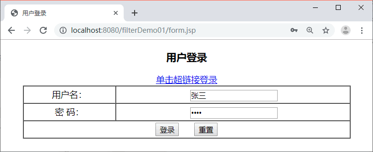 在 filterDemo01 項(xiàng)目的 WebContent 目錄中編寫一個(gè) form.jsp 頁面,該頁面用于提交用戶登錄的表單信息,如下所示。