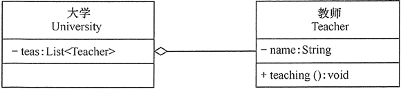 在 UML 類圖中,聚合關(guān)系可以用帶空心菱形的實(shí)線來(lái)表示,菱形指向整體。圖 6 所示是大學(xué)和教師的關(guān)系圖。