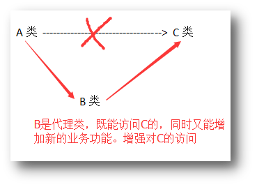 例如: 有A,B,C三個類, A原來可以調(diào)用C類的方法, 現(xiàn)在因為某種原因C類不允許A類調(diào)用其方法,但B類可以調(diào)用C類的方法。A類通過B類調(diào)用C類的方法。這里B是C的代理。 A通過代理B訪問C.