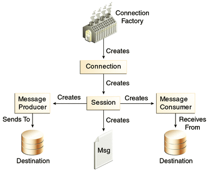 它們的關(guān)系是:一旦有了ConnectionFactory,就可以創(chuàng)建Connection,一旦有了Connection,就可以創(chuàng)建Session,而一旦有了Session,就可以創(chuàng)建Message、MessageProducer和MessageConsumer。