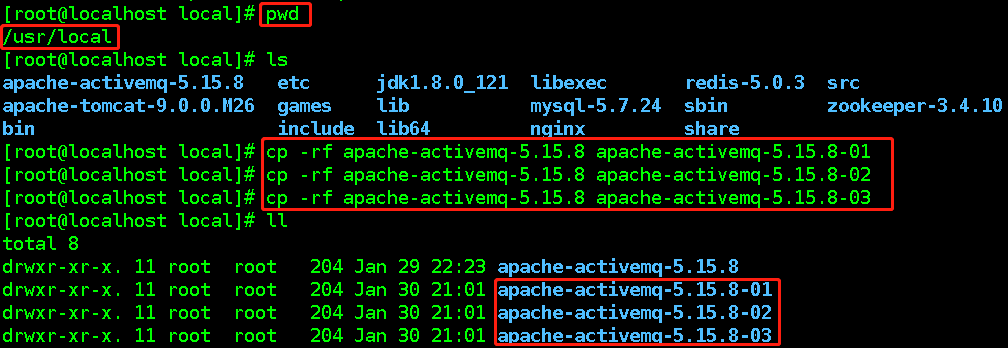 因?yàn)锳ctiveMQ的安裝和Tomcat一樣,解壓就可以使用,所以我們直接在/usr/local目錄下復(fù)制多份,就相當(dāng)于安裝了多個(gè)ActiveMQ,我們這里復(fù)制3個(gè)ActiveMQ出來(lái)。