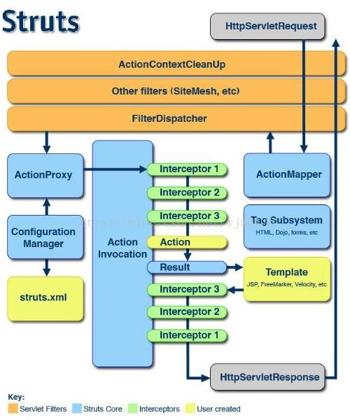● Interceptor(攔截器):是Struts2的基石,類(lèi)似于JavaWeb的Filter,攔截器是一些無(wú)狀態(tài)的類(lèi),攔截器可以自動(dòng)攔截Action,它們給開(kāi)發(fā)者提供了在Action運(yùn)行之前或Result運(yùn)行之后來(lái)執(zhí)行一些功能代碼的機(jī)會(huì)。