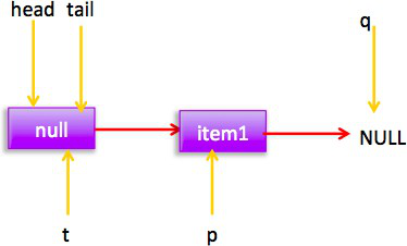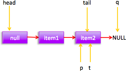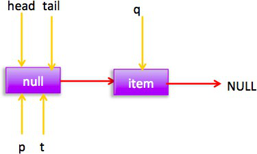 如上代碼初始化時候會構(gòu)建一個 item 為 NULL 的空節(jié)點(diǎn)作為鏈表的首尾節(jié)點(diǎn)。