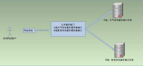 公司或者企業(yè)有很多的服務(wù),這些服務(wù)有不同的部門(mén),不同的人員管理,維護(hù)。例如公司做生活服務(wù)類(lèi)業(yè)務(wù)的,提供類(lèi)似 58 同城的業(yè)務(wù)。其中公共服務(wù)部門(mén)負(fù)責(zé)提供天氣資訊和影視資訊兩個(gè)內(nèi)容。A 小組兩個(gè)人負(fù)責(zé)天氣資訊;B 小組三個(gè)人負(fù)責(zé)影視資訊。現(xiàn)在需要在公司的網(wǎng)站同時(shí)提供兩種資訊。你作為網(wǎng)站開(kāi)發(fā)人員需要使用 A 和 B 兩個(gè)小組不同服務(wù)內(nèi)容。使用 A 組,B 組的兩個(gè)服務(wù)提供者接口。