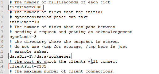 tickTime: 心跳的時間,單位毫秒. Zookeeper 服務器之間或客戶端與服務器之間維持心跳的時間間隔,也就是每個 tickTime 時間就會發(fā)送一個心跳。表明存活狀態(tài)。