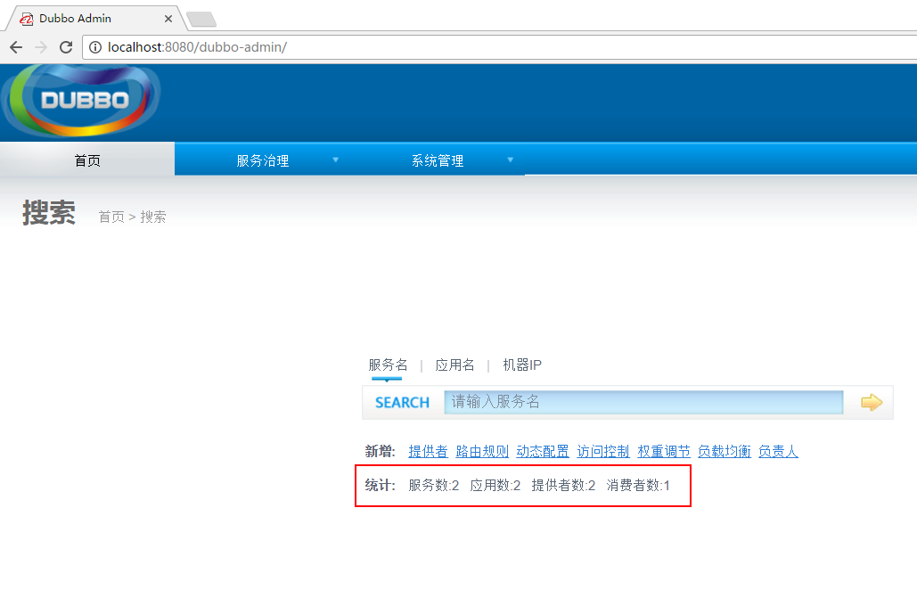 ● 在瀏覽器地址欄輸入 http://localhost:8080/dubbo-admin 。訪問監(jiān)控中心-控制臺。