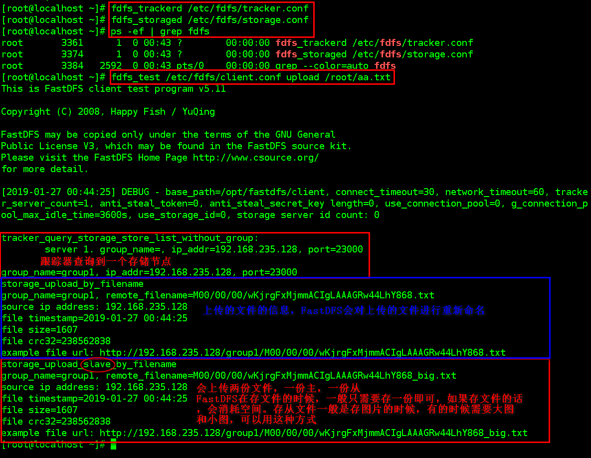 ● 執(zhí)行上傳命令fdfs_test /etc/fdfs/client.conf upload /root/aa.txt