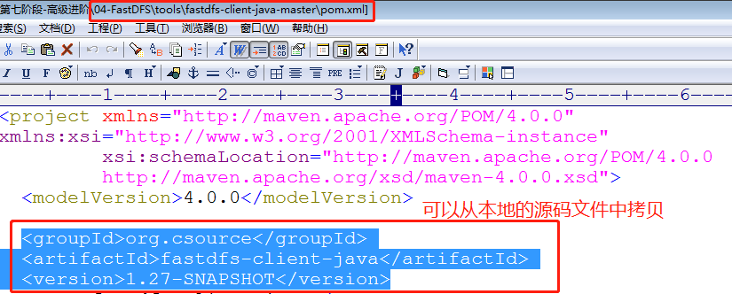 2. 在pom.xml文件中添加我們打包好的FastDFS本地倉(cāng)庫(kù)的jar包(FastDFS的java客戶端依賴)