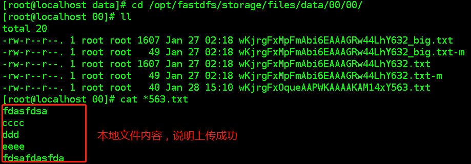 5. 運(yùn)行程序,在Linux上,F(xiàn)astDFS存儲(chǔ)目錄下查看上傳文件內(nèi)容
