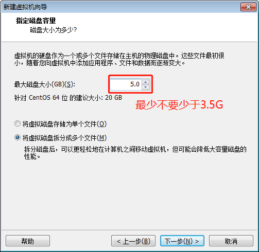 迷你版Linux沒(méi)有圖形界面,占用磁盤及資源小,企業(yè)里面使用的Linux都是沒(méi)有圖形界面的Linux,在安裝的時(shí)候,最少要給每一個(gè)虛擬機(jī)分配3.5G的內(nèi)存空間,我這里分配5G,內(nèi)存我這里分配的是512M