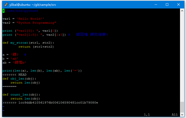 假設(shè)maxsu決定保留修改的代碼,并刪除了自己定義的函數(shù):obj_len(obj)。刪除沖突標(biāo)記后(<<<<<<<<<<<<<<<< 和 >>>>>>>>>>>>>>>>>>>>的行),現(xiàn)在沖突的代碼如下所示: