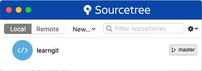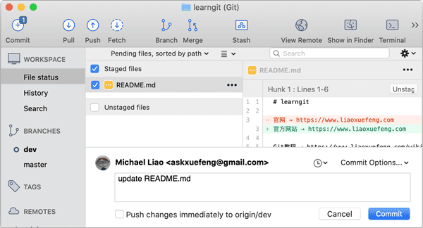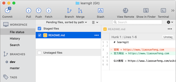 我們雙擊learngit這個(gè)本地庫(kù),SourceTree會(huì)打開另一個(gè)窗口,展示這個(gè)Git庫(kù)的當(dāng)前所有分支以及文件狀態(tài)。選擇左側(cè)面板的“WORKSPACE”-“File status”,右側(cè)會(huì)列出當(dāng)前已修改的文件(Unstaged files):