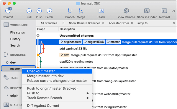 在左側(cè)面板的“BRANCHES”下,列出了當(dāng)前本地庫(kù)的所有分支。當(dāng)前分支會(huì)加粗并用○標(biāo)記。要切換分支,我們只需要選擇該分支,例如master,然后點(diǎn)擊右鍵,在彈出菜單中選擇“Checkout master”,實(shí)際上是執(zhí)行命令git checkout master: