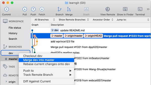 要合并分支,同樣選擇待合并分支,例如dev,然后點(diǎn)擊右鍵,在彈出菜單中選擇“Merge dev into master”,實(shí)際上是執(zhí)行命令git merge dev: