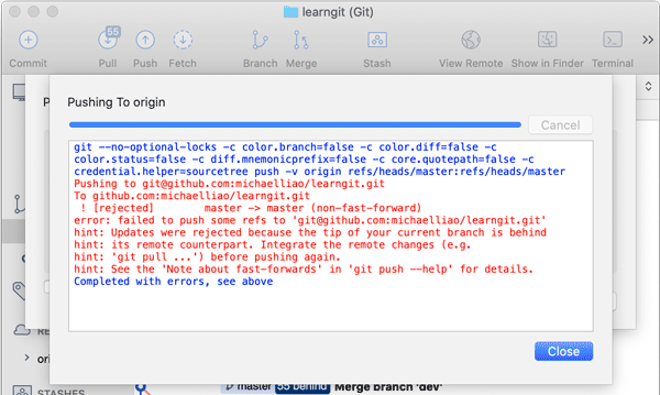 注意到使用SourceTree時(shí),我們只是省下了敲命令的麻煩,SourceTree本身還是通過(guò)Git命令來(lái)執(zhí)行任何操作。如果操作失敗,SourceTree會(huì)自動(dòng)顯示執(zhí)行的Git命令以及錯(cuò)誤信息,我們可以通過(guò)Git返回的錯(cuò)誤信息知道出錯(cuò)的原因: