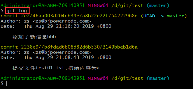 我們可以觀察到兩次提交,分別對應(yīng)兩個(gè)40位的哈希值,這就是我們提交后記錄的版本號