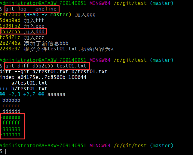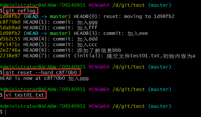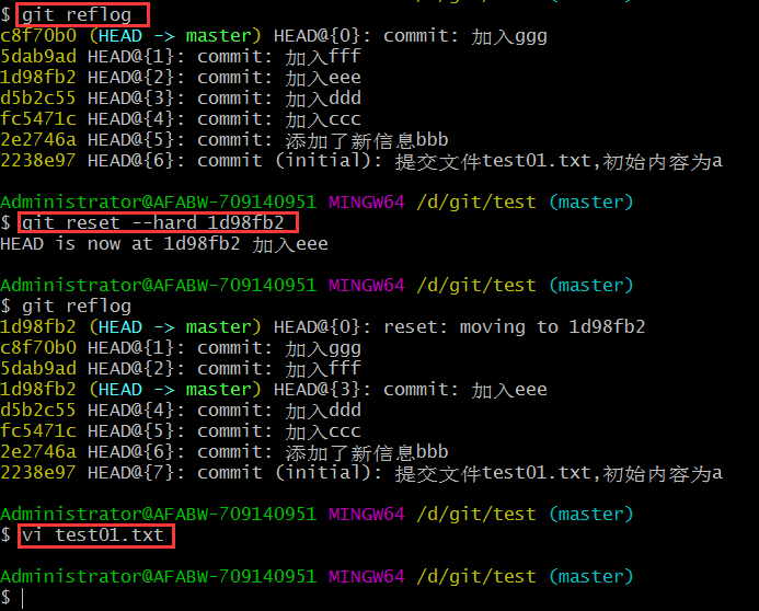 最后觀察vi test01.text 文件是回到了eee的歷史版本