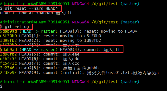 通過git reset --hard eee的哈希 回到歷史