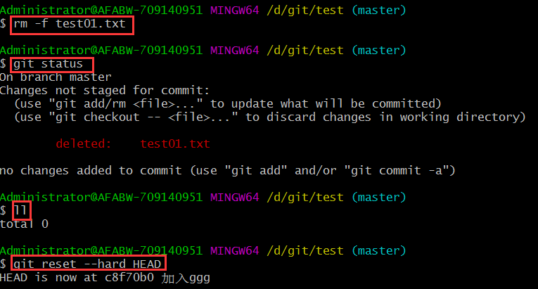 通過以上歷史版本我們觀察到,最后一個(gè)版本af1eb78是刪除了文件,但是我們可以看到最新的加入ggg的版本為c8f70b0,此時(shí)還是有test01.txt這個(gè)文件的,我們可以回到c8f70b0這個(gè)版本。