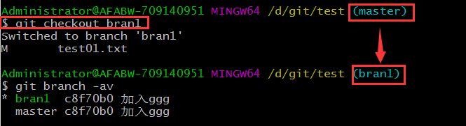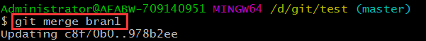 我們切換到master分支上執(zhí)行命令 git merge bran1 就會將bran1中的信息進(jìn)行整合