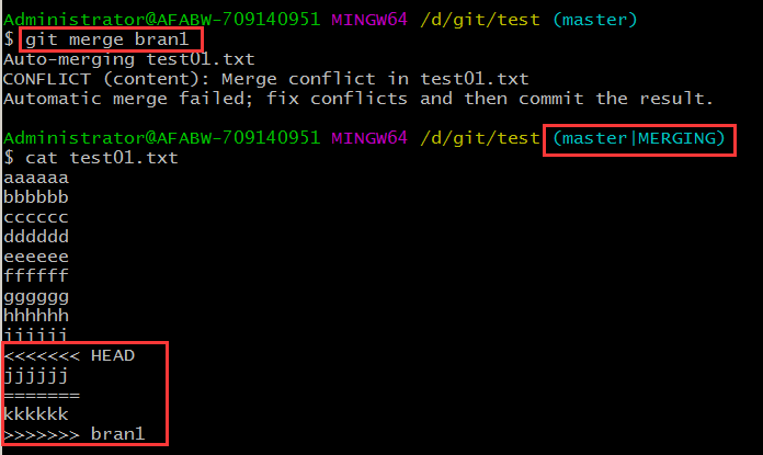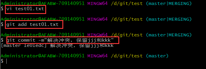 首先編輯test01.txt文件,保留有用信息(協(xié)商解決),刪除(作為沖突標(biāo)識的)特殊符號
