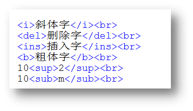 1、粗體字<b>顯示內(nèi)容</b> 2、斜體字 <i>顯示內(nèi)容</i> 3、插入字<ins>顯示內(nèi)容</ins> 4、刪除字 <del>顯示內(nèi)容</del> 5、font標(biāo)簽<font color=”” size=””>顯示內(nèi)容</font> 6、右上角加字:10<sup>2</sup> 7、右下角加字:10<sub>m</sub>