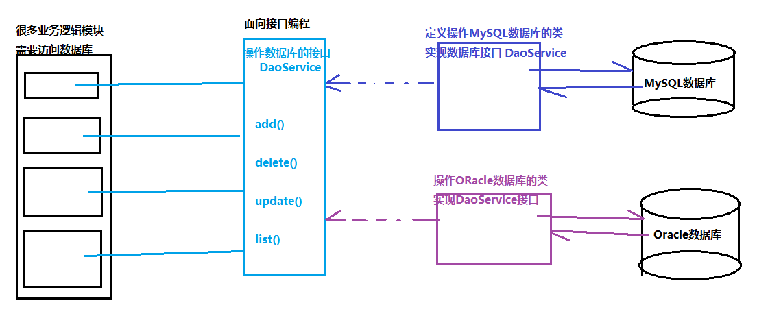 //如果數(shù)據(jù)庫由MySQL換為Oracle, 需要定義一個(gè)操作ORacle數(shù)據(jù)庫的類,修改業(yè)務(wù)邏輯模塊 dao接口的配置