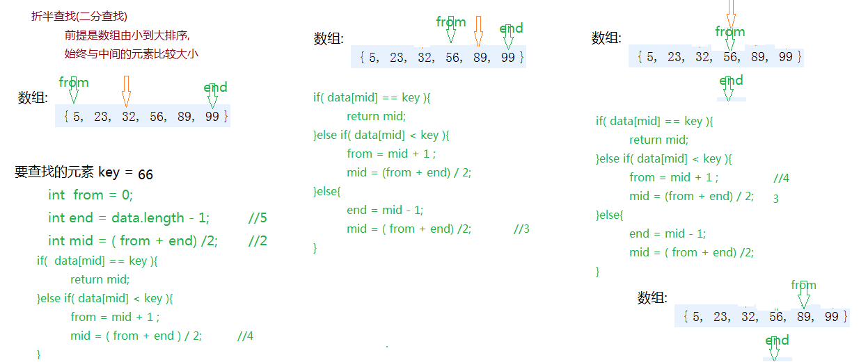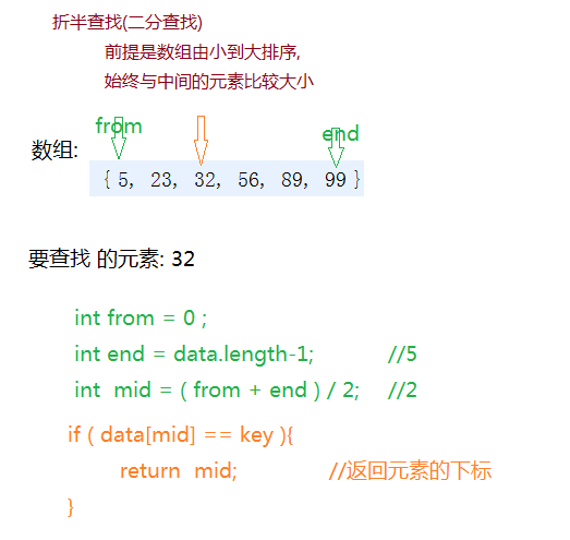 前提是數組已經由小到大排序, 在比較時,始終和中間的元素比較, 如果要查找的數比中間的數小, 說明在左一半; 如果要查找的數比中間的數大, 說明在右一半