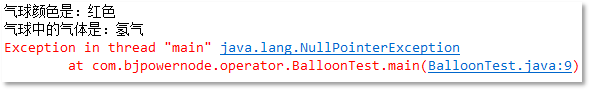 以上程序語法正確,編譯通過,因為程序在編譯階段檢測出“引用ball”屬于Balloon類型,在Balloon類中有color屬性,所以編譯器允許通過ball引用去訪問color屬性,例如以上代碼的ball.color。但是程序在運行階段會通過ball引用查找堆內(nèi)存當(dāng)中的對象,因為color是實例變量,該變量存儲在java對象內(nèi)部,當(dāng)ball = null執(zhí)行之后表示“引用ball”不再保存java對象的內(nèi)存地址,換句話說通過ball引用已經(jīng)無法找到堆內(nèi)存當(dāng)中的java對象了,對于程序來說這個時候就沒有辦法正常訪問了,這種情況下就會發(fā)生空指針異常。就好比一個小孩兒放風(fēng)箏,通過拽線來操控風(fēng)箏,結(jié)果線斷了,再拽風(fēng)箏線的時候,已經(jīng)無法再操控風(fēng)箏了,這對于小孩兒來說是一種異常。而java程序中把這種異常叫做NullPointerException。