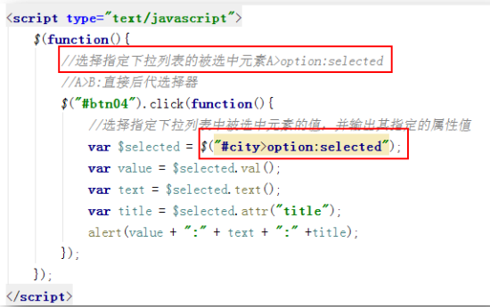 注意,selected=”selected”是<option/>的屬性值,而非<select/>的,所以首先要選擇 select的子元素#city>option。