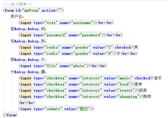 在中定義被選擇對象<form/>,其中定義了表單元素文本框、單選框、復(fù)選框、文件選擇框等。