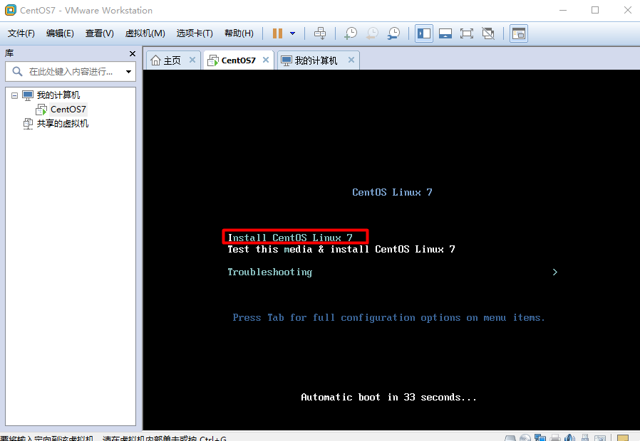 鼠標在黑色屏幕點擊一下, 才能使用上下箭頭選擇要執(zhí)行的操作。“Install CentOs Linux 7” ,白色文字的當前的選中狀態(tài)。 從屏幕退出使用 ctrl + alt 鍵。