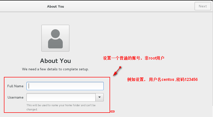 輸入 Full Name , Username 都是 centos ,點擊 “next” 。設(shè)置密碼