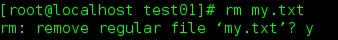 在 test01 目錄執(zhí)行 echo “ok” > my.txt 創(chuàng)建一個(gè) my.txt 的文件在執(zhí)行 rm mytxt.txt 回車(chē)后, 系統(tǒng)會(huì)提示是否刪除確認(rèn)