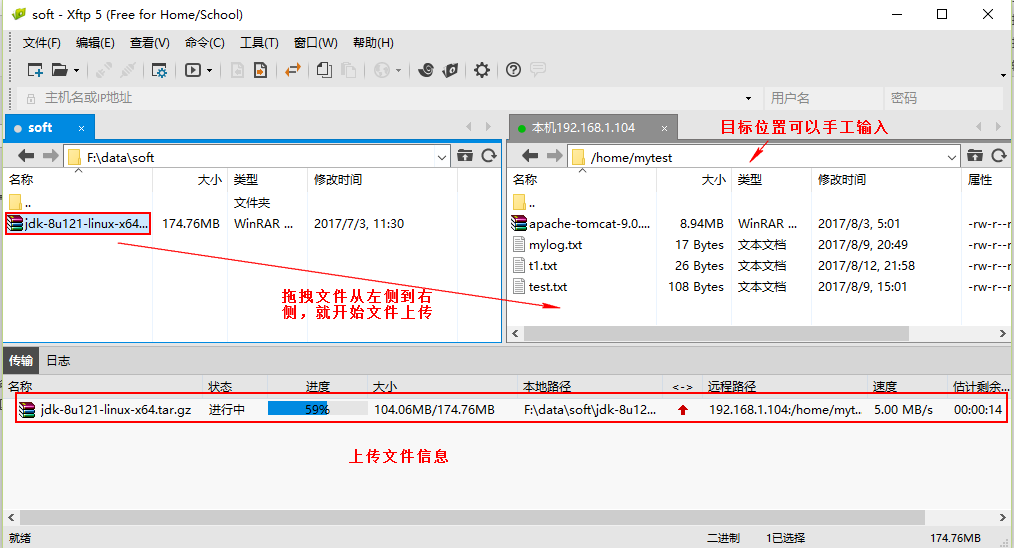 選擇本機(jī)的 jdk-8u121-linux-x64.tar.gz 從左側(cè)拖拽到右側(cè)的某個(gè)目錄。