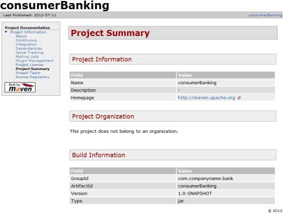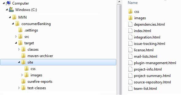 打開 C:\MVN\consumerBanking\target\site 文件夾。點擊 index.html 就可以看到文檔了。