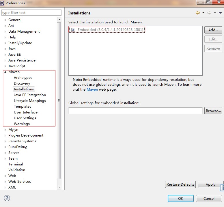 在最新的 Eclipse 中自帶了 Maven,我們打開,Windows->Preferences,如果會出現(xiàn)下面的畫面: