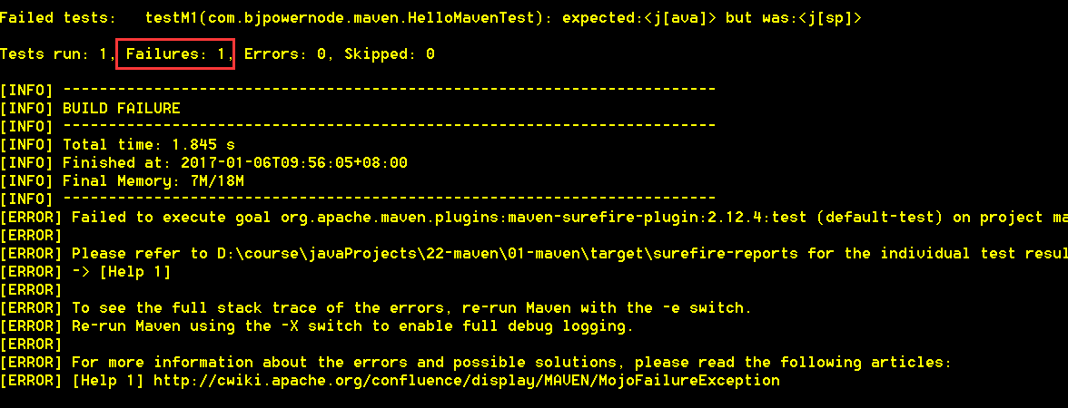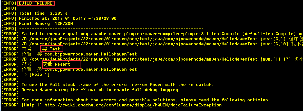 第二步:來到 D:\course\javaProjects\22-maven\maven-01 目錄下,運行 mvn test 執(zhí)行測試程序,會出現(xiàn)如下錯誤