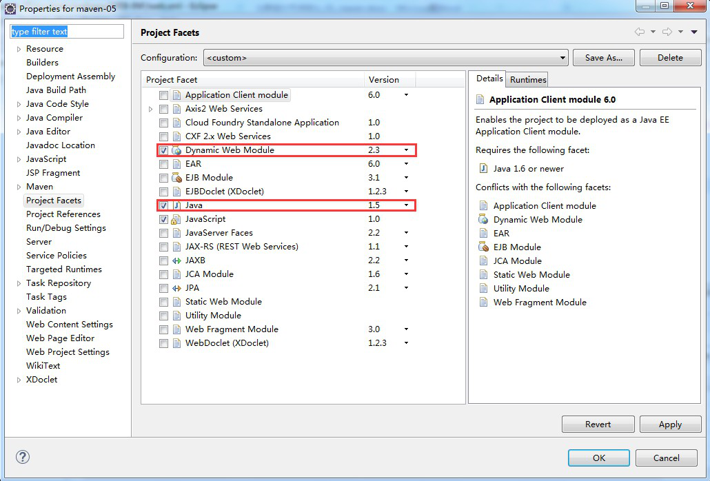 第二步:選中工程右鍵 PropertiesàProject Facets,目前這里使用的還是 2.3 和 1.5,這里設置的是 Maven 插件的版本,不是 eclipseIDE 的版本
