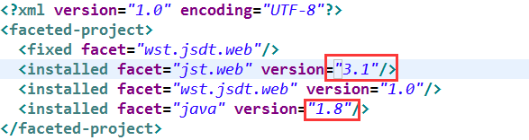 第三步:在navigator 的視圖下找到項目下的.setting 文件夾,打開文件org.eclipse.wst.common.project.facet.core.xml,將 jdk 從 1.5 修改為 1.8, jst.web 修改成 3.1