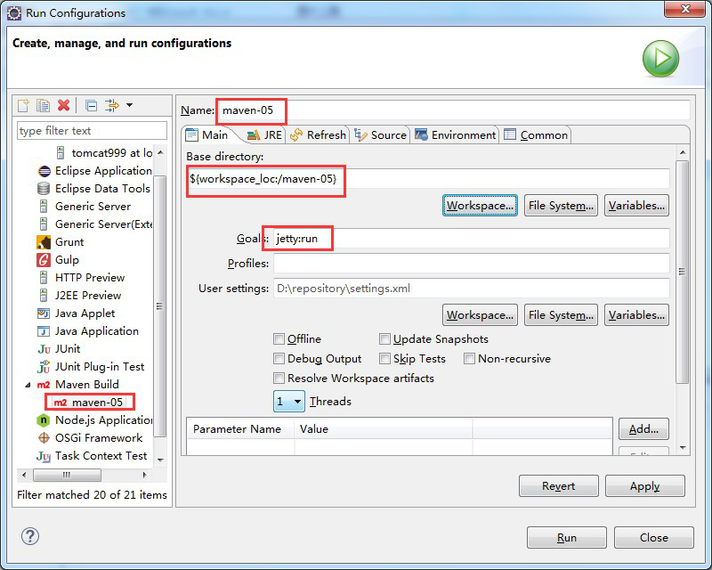 ⒌ 在 Goals 框中輸入:jetty:run