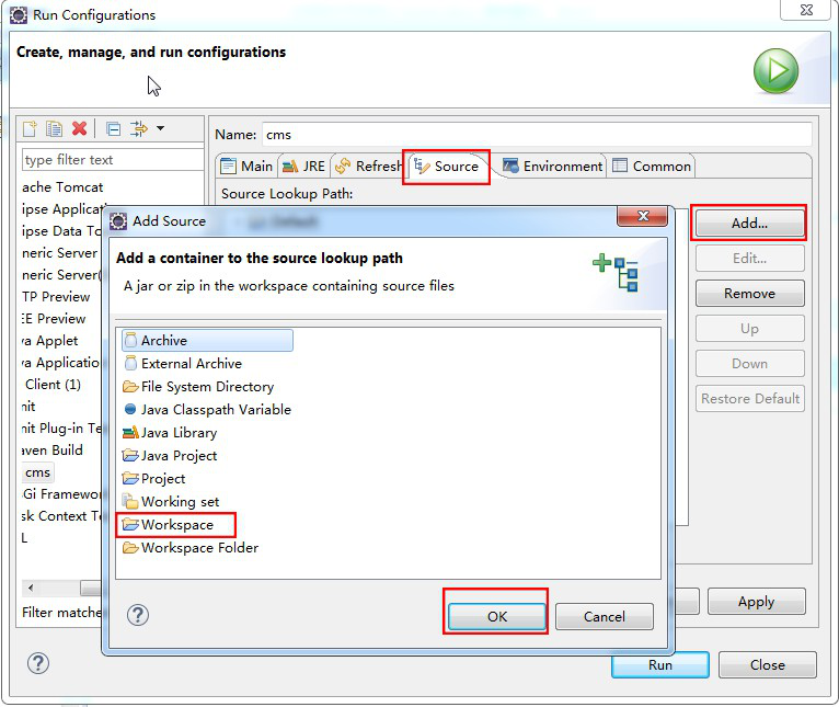 如果在程序調試過程中出現(xiàn)無法關聯(lián)源碼現(xiàn)象,需在運行配置窗口中的 source(源碼)選項卡中填加 workspace(工作空間)選項