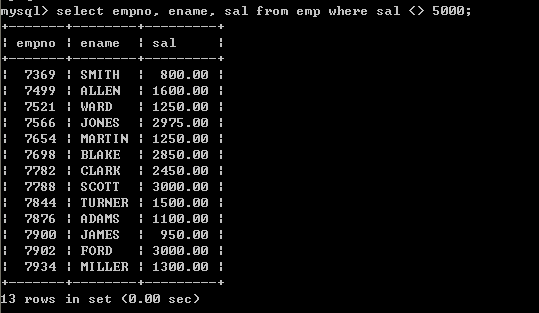 ● 查詢出薪水不包含1600和薪水不包含3000的員工(第三種寫法)
