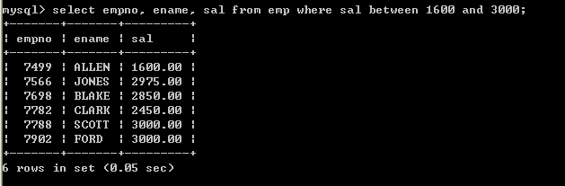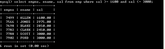 ● 查詢薪水為1600到3000的員工(第一種方式,采用between … and …)