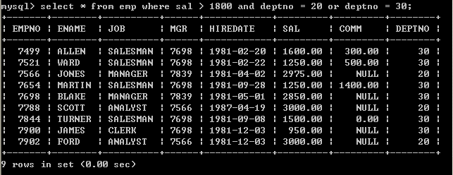 select * from emp where sal > 1800 and deptno = 20 or deptno = 30;